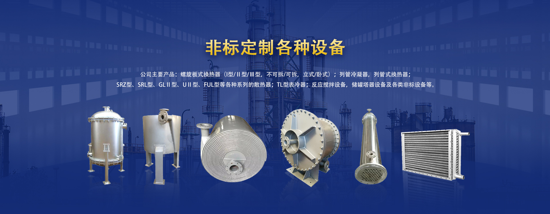 公司主要產(chǎn)品:螺旋板式換熱器(I型/Ⅱ型/Ⅲ型,不可拆/可拆,立式/臥式);列管冷凝器,列管式換熱器;SRZ型、SRL型、GLⅡ型、UⅡ型、FUL型等各種系列的散熱器;TL型表冷器;反應(yīng)攪拌設(shè)備,儲(chǔ)罐塔器設(shè)備及各類(lèi)非標(biāo)設(shè)備等。